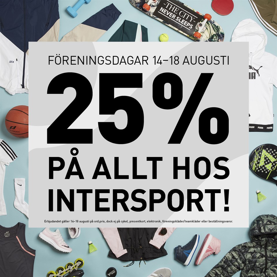 Denna vecka, med start onsdag 14.8 är det Föreningsdagar på Intersport. Som medlem i TEIBK får du 25% på allt i butiken utom på cyklar, presentkort, elektronik, föreningskläder eller beställningsvaror. Ta med inbjudan ovan(i din smartphone) eller använd rabattkoden Förening25 på intersport.se Passa på att gynna en av våra huvudsponsorer - och Dig själv naturligtvis!! Trosa Edanö IBK 12 aug 2019 0kommentarer