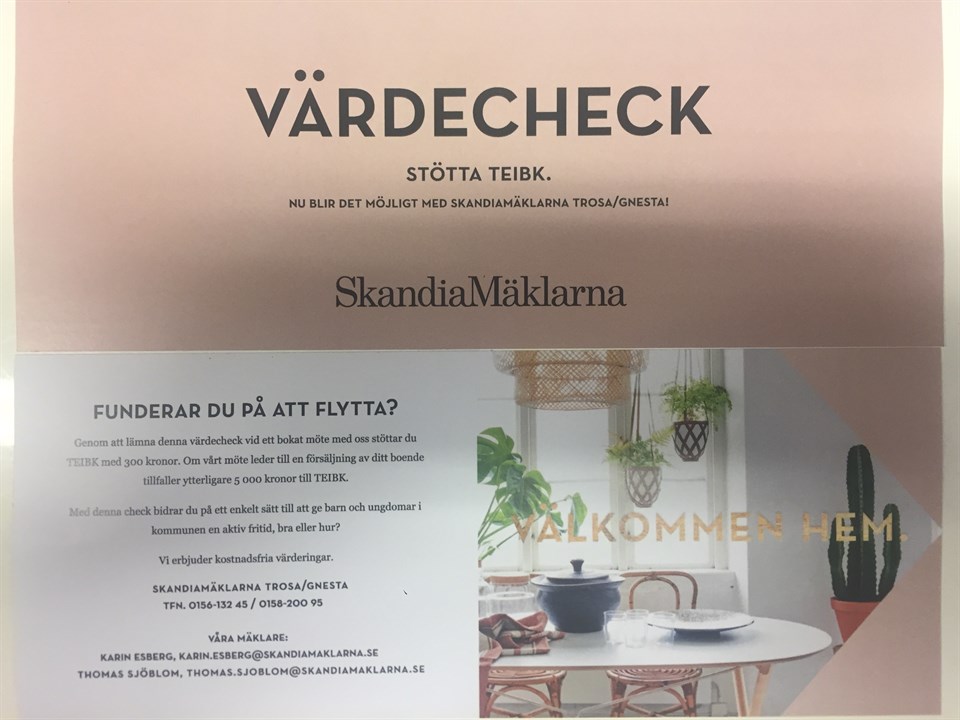 Det är med glädje vi kan presentera Skandiamäklarna som ny samarbetspartner till Trosa Edanö IBK, ett samarbete som kommer att sträcka sig till våren 2020! Förutom att man stöttar föreningen ekonomiskt så kommer också ett projekt att sjösättas i helgen. I korthet går det ut på att våra medlemmar hjälper till att förmedla kontakter på de som ska sälja sin villa/bostadsrätt eller sommarstuga. För varje sådan kontakt som leder till ett säljsamtal får vi 300:- som tillfaller det lag som förmedlat kontakten! Om det däremot blir ett avslut så erhåller TEIBK hela 5.000:-. Här går 1.500:- direkt till laget som ordnat kontakten! En fantastisk kick-back och nu är det upp till oss att lyssna runt bland grannar och bekanta och ge dem en värdecheck när de funderar på bostadsbyte!. I samband med Trosa Edanö-dagen på söndag så kommer våra medlemmar att få dessa värdecheckar och ett infoblad! - Det ska bli så himla roligt. Vi är jättepeppade, säger Kajsa Kromner hos Skandiamäklarna! Undertecknad kan bara hålla med! Nu kör vi!