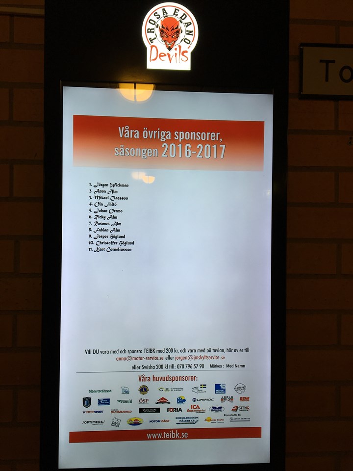 Äntligen är vår digitala Sponsorskylt i full bruk. Välkommen att ge ditt bidrag till vår fina klubb genom att swisha 200kr till Anna Alm på 070 796 57 90. Som tack för stödet får du ditt namn på tavlan under innevarande säsong. Skylten kommer också till bra användning på våra större arrangemang såsom Junior-SM där vi visar spelscheman, resultat etc. Delad glädje är dubbel glädje!! //Sponsorgruppen Trosa Edanö IBK 5 nov 2016 0kommentarer