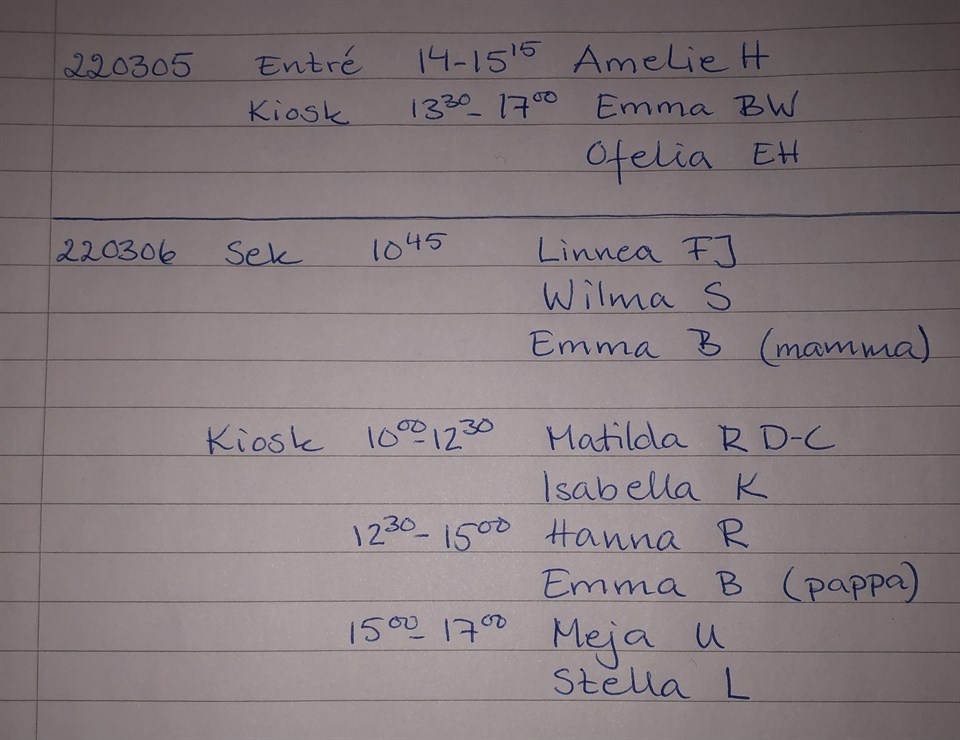 Hej Här kommer ett uppdaterat schema samt lite information. Vi har varit i kontakt med kansliet och har där efter redigerat lite tider. Vi är tyvärr väldigt få tjejer i laget så alla behöver verkligen hjälpa till denna helg då vi både har hemma match och kiosken. Vi försöker i största möjliga mån att inte använda tränarnas familjer, då dom ställer upp för våra tjejer flera dagar i veckan. Kioskinformation finns under dokument på laget.se, Lollo hämtar nyckeln inför helgen. Med vänlig hälsning, Cissi och Lollo DJ 21 feb 2022 3kommentarer