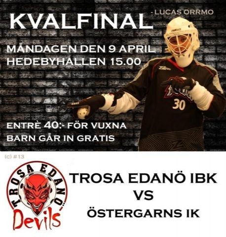 Ikväll så drar herrlaget till Gotland för att sussa in och drömma om en seger på ön. För att imorgon vakna upp och spela första kvalmatchen av två mot Östergarns IK. Imorgon kl.12.00 är det nedsläpp i södervärnshallen. Vad vet vi om motståndet då, ja ärligt talat. . . ingenting ! Vi vet att Östergarn vann sin serie helt överlägset. De vann 15 matcher och kryssade 1 och gjorde hela 227 mål framåt, och släppte bara in 67 baljor. Vi bör iaf se upp för en trio spelare: Niklas Nylander 10 spelade matcher = 29+21 poäng Tobias Dahlström 10 spelade matcher = 25+17 poäng Rickard Berggren 9 spelade matcher = 23+19 poäng En rent poängplockande trio som iaf imponerar på mig. Hos oss har det annars tyvärr handlat en hel del om sjukdomar. Nu är vi i alla fall friska alla utom Martin Gard. Gardan kommer dock att följa med, men spel är knappast troligt. Vi tar därför och plockar med Marcus Klaesson istället. Även Andreas Lindgren (utomlands) och Albin Carlsson(jobb) är frånvarande. Annars så åker vi med gott mod och en riktigt sugen spelartrupp. Träningen igår lovar mycket gott. Hoppas att alla ni som inte kommer till Gotland stöttar oss här på hemsidan eller på Facebook. Ni kan iaf följa matchen på liverapporteringen på innebandy.se Sen så syns vi på måndag i hedebyhallen kl.15.00 för returmötet. !! Forza Devils !!