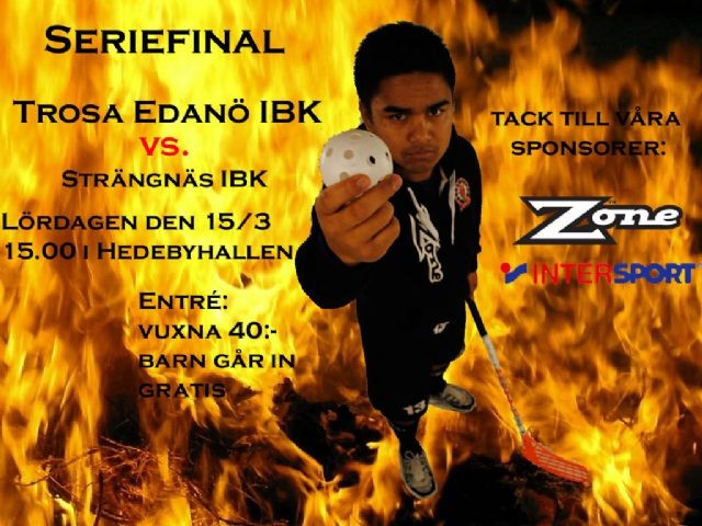 Då börjar det närma sig! Snart nalkas det seriefinal i herrar division 2, då serieettan Strängnäs IBK besöker serietvåan Trosa Edanö IBK. Man kan förstås följa matchen på alla möjliga sätt, men mitt tips är att komma dit och sätta publikrekord. Samt att förhoppningsvis se en grymt jämn tillställning, men tänk på att vara i tid. För det kommer att vara hårt om dem bästa platserna. Kan man inte vara på plats så kan man följa matchen via någon av länkarna nedanför. Titta på matchen live på internet Följ matchen på livematch Vi hoppas som sagt att det blir en grym tillställning! Läget i Trosa Edanö är att samtliga utan Daniel Öberg finns tillgängliga för spel. Annars kan som sagt alla vara med och fajtas om spelplatserna! Väl mött 15.00 i Hedebyhallen på lördag! ////#13