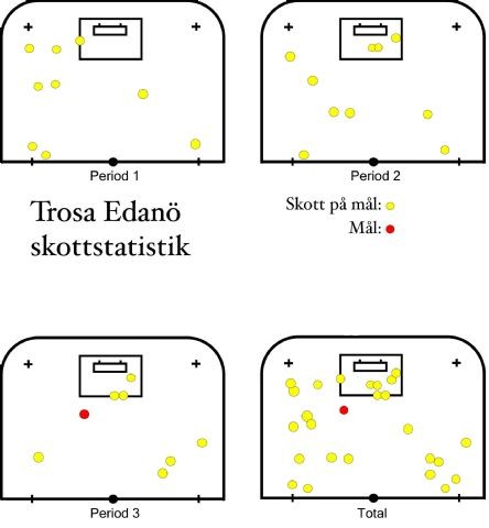 Antalet skott på mål per spelare: Pip: 4 JC: 4 Malm: 3 Crona: 3 Phille: 3 Friman: 2 Hasse: 2 Micke: 2 (varav ett mål) Robban: 2 Linko: 1 TK: 1 Ogges räddningsstatistik: Period 1: 93% Period 2: 87,5% Period 3: 67% Total: 81% (6 mål på 31 skott)